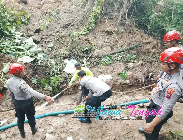 Setibanya di lokasi, aparat kepolisian bergabung dengan anggota TNI, perangkat desa, dan puluhan warga. Dengan peralatan sederhana seperti cangkul dan sekop, mereka bergotong royong membersihkan material longsor untuk membuka kembali aliran sungai.