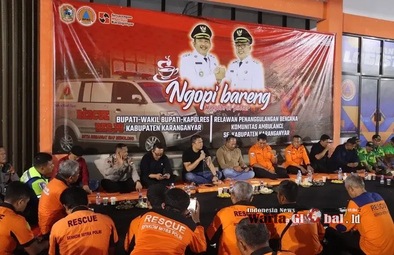 Bupati dan Kapolres Karanganyar hadiri Ngopi Bareng bersama Koordinasi Relawan Penanggulangan Bencana Kabupaten Karanganyar Tahun 2025 yang digelar di Kantor BPBD Karanganyar pada Kamis (16/10/25) malan.