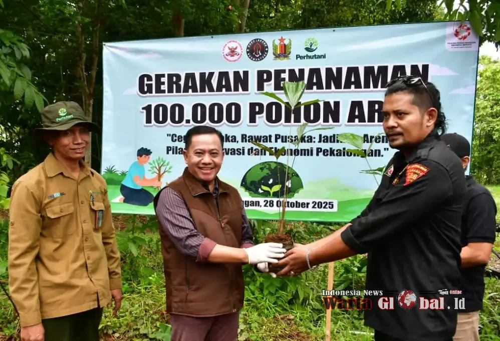 Wabup Pekalongan Sukirman mendukung Penanaman 100 Ribu Pohon Aren oleh kelompok Ormas Grib Jaya dan LSM Sodo Lanang Nuswantoro dan Perum Perhutani (KPH) Pekalongan Timur untuk Cegah Bencana Alam, Selasa (28/10/25).PEKALONGAN, WARTAGLOBAL.id --