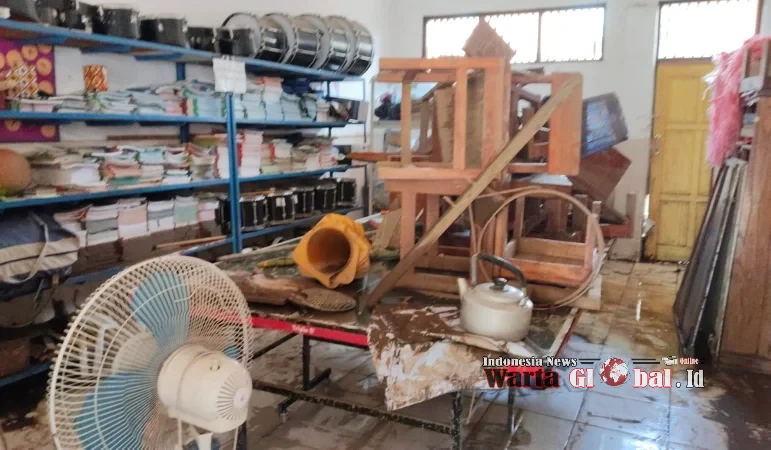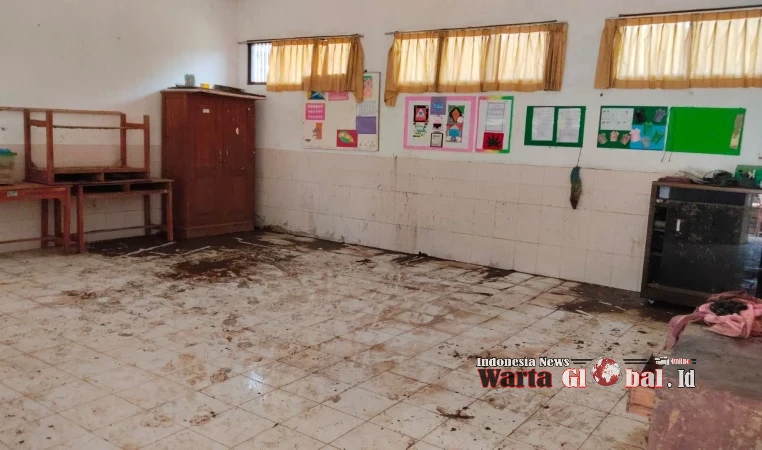 Tuang Kelas SDN 04 Kalierang Bumiayu lantainya tertutup lumpur akibat diterjang banjir.BREBES, WARTAGLOBAL.id --