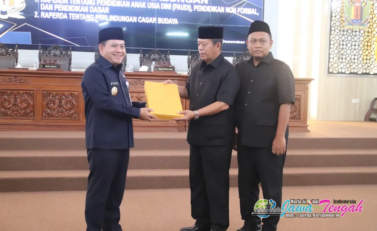 Ketua DPRD Kabupaten Pekalongan, Drs. H. Abdul Munir menyerahkan Dua Raperda Inisiatif, Fokus Pendidikan dan Perlindungan Cagar Budaya kepada Wakil Bupati Pekalongan Sukirman, Rabu (24/12/25)PEKALONGAN, WARTAGLOBAL.id --
