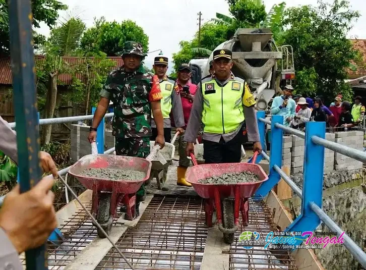 Petugas Polres Sragen semangat giat membangun Jembatan Desa Slogo, Senin (29/12/25).SRAGEN, WARTAGLOBAL.id --