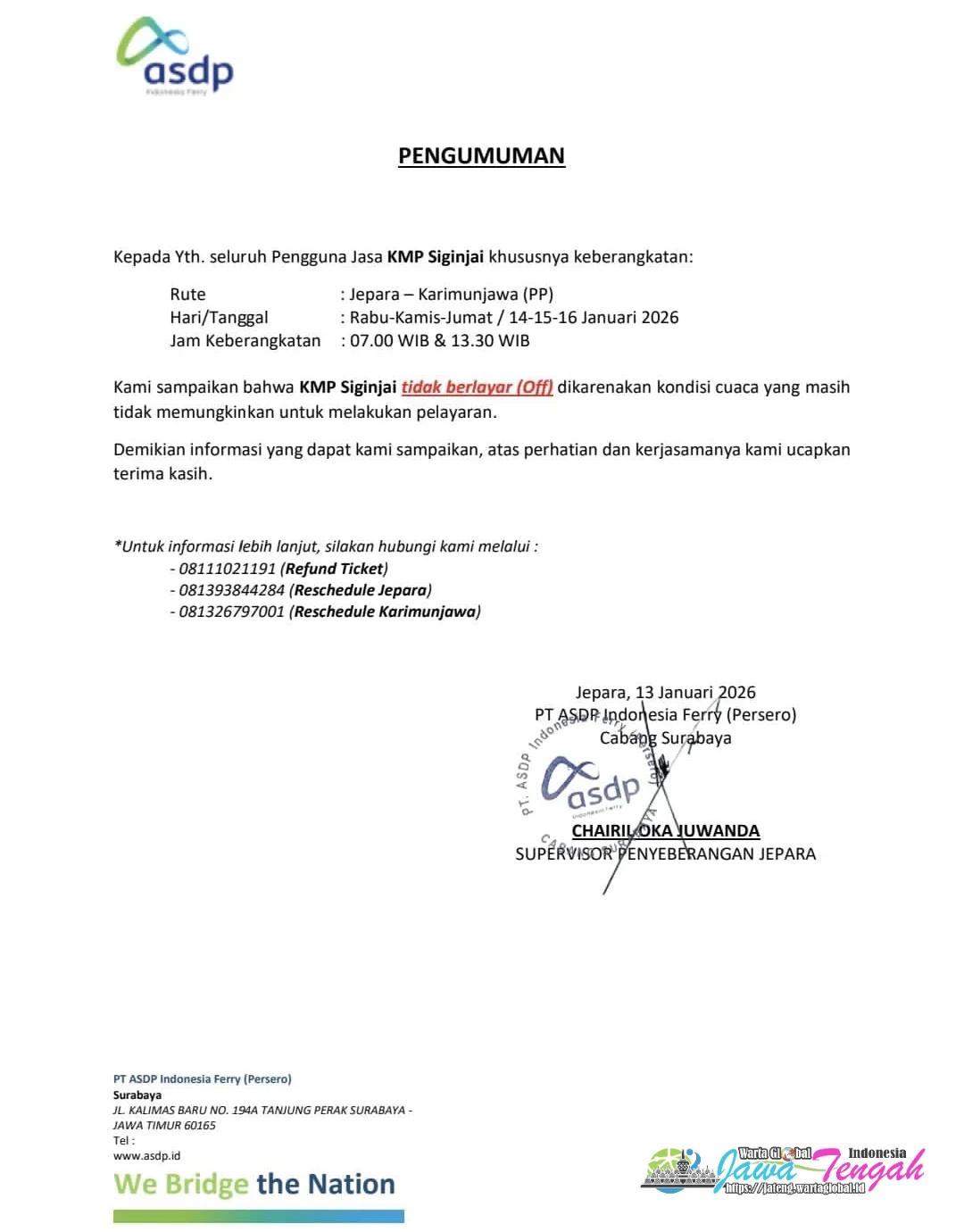 Supervisor Usaha Pelabuhan dan Penyeberangan Jepara Cabang Surabaya PT ASDP Indonesia Ferry (Persero), Chairil Oka Juanda, menyampaikan pengumuman resmi bahwa: