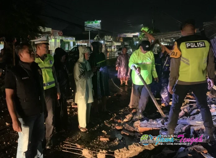 Suasana di kompleks Ruko Gaden Plaza, Desa Pegaden Tengah, Kecamatan Wonopringgo, Kabupaten Pekalongan mencekam pada Jumat (16/1/2026) malam. Tembok bagian atas ruko tersebut tiba-tiba roboh dan menimpa deretan toko di bawahnya saat wilayah tersebut sedang diguyur hujan deras.