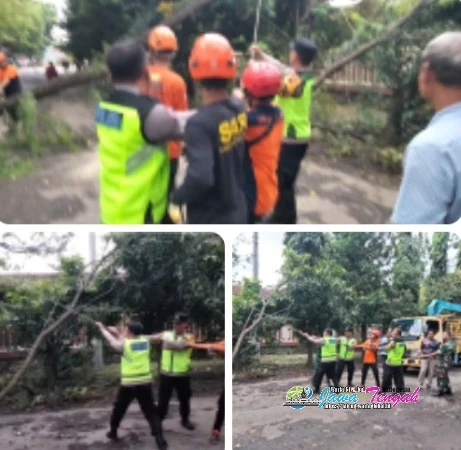 Petugas Gabungan TNI-Polisi dan BPBD Gerak Cepat Evakuasi Ranting Pohon Patah di Depan SMKN 1 Kedungwuni Pekalongan, Selasa (13/1/26)."Proses evakuasi dilakukan mulai pukul 16.20 WIB hingga 17.30 WIB. Kami bersama rekan-rekan dari TNI, BPBD, dan PLN memotong ranting pohon tersebut menggunakan gergaji mesin agar kabel listrik bisa segera dibebaskan dan jalan kembali terbuka," tambah Iptu Yonanta.
