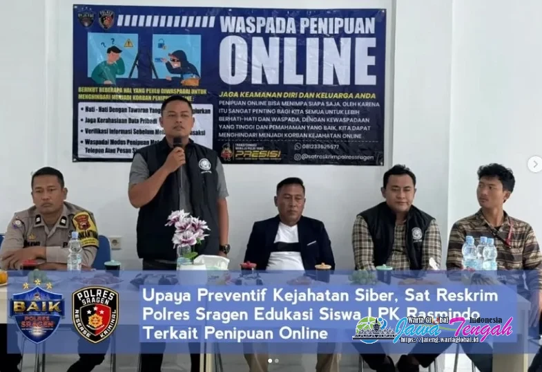 Upaya pencegahan kejahatan di dunia maya terus digencarkan oleh Polres Sragen. Salah satunya diwujudkan melalui kegiatan sosialisasi pencegahan penipuan online yang dilaksanakan Satuan Reserse Kriminal (Sat Reskrim) melalui Unit Tindak Pidana Tertentu (Tipidter), Kamis (15/1/26). Kegiatan ini menyasar siswa-siswi LPK Rasmindo Mitra Sukses yang berlokasi di Desa Kedungupit, Sragen.