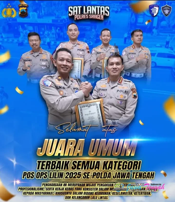 Konsistensi kinerja dan dedikasi berkelanjutan dalam menjaga keselamatan masyarakat mengantarkan Satuan Lalu Lintas Polres Sragen meraih prestasi membanggakan. Di akhir pelaksanaan Operasi Lilin 2025, Satlantas Polres Sragen dinobatkan sebagai Juara Umum Pos Operasi Lilin Terbaik se-Polda Jawa Tengah.