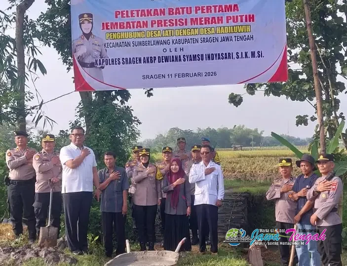 Pembangunan Jembatan Presisi Merah Putih yang menghubungkan Desa Jati dan Desa Hadiluwih, Kecamatan Sumberlawang, resmi dimulai dengan prosesi peletakan batu pertama pada Rabu (11/2/26). Kegiatan tersebut dipimpin langsung oleh Kapolres Sragen, AKBP Dewiana Syamsu IndyasarI, S.I.K., M.Si.
