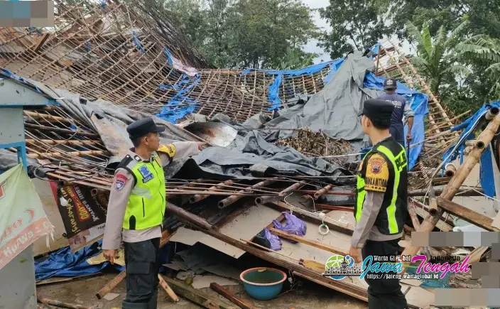 Mendapat laporan tersebut, personil Polsek Sragi langsung diterjunkan ke lokasi kejadian pada Senin (16/2/2026) pagi untuk melakukan pendataan dan membantu evakuasi material bangunan yang hancur.