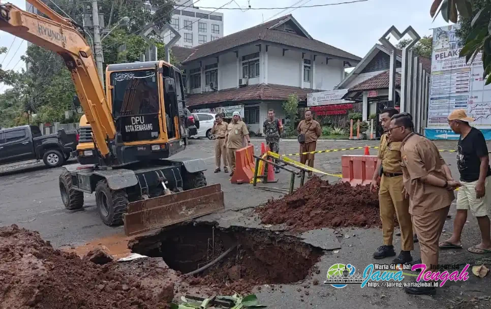Pemerintah Kota (Pemkot) Semarang melalui Dinas Pekerjaan Umum (DPU) bergerak cepat menangani jalan ambles yang menyebabkan adanya lubang besar di depan Kantor Dinas Pendidikan (Disdik) Kota Semarang, Senin (23/2/26).