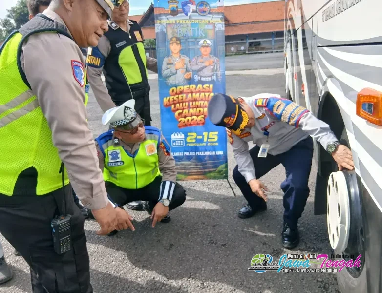 Petugas Satlantas Polres Pekalongan Kota periksa keadaan bus saat Gelar Ramp Check dan Cek Kesehatan Awak Bus di Terminal, Rabu (11/2/26).PEKALONGAN KOTA, WARTAGLOBAL.id --
