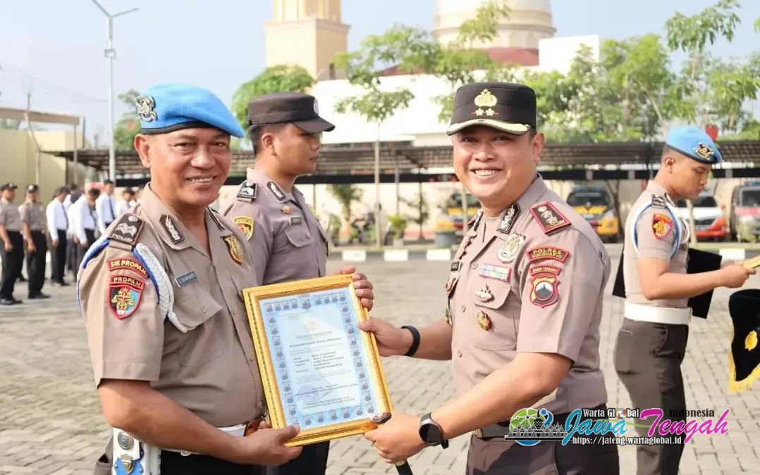 Kapolres Sukoharjo, AKBP Anggaito Hadi Prabowo, saat memberikan Plakat Penghargaan kepada seorang Personel yang Berprestasi, Senin (6/4/26).SUKOHARJO, WARTAGLOBAL.id --