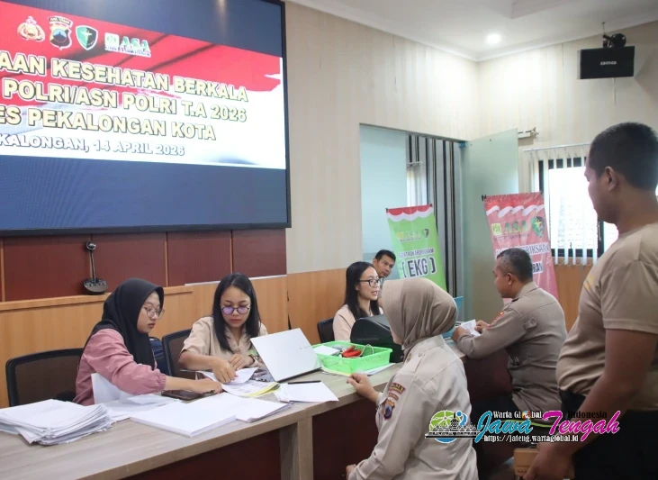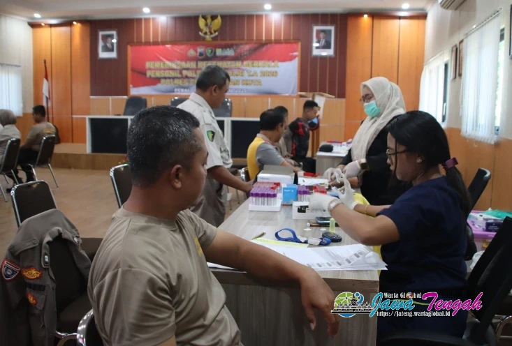 Ratusan personel Polres Pekalongan Kota bersama sejumlah anggota dari polres jajaran mengikuti kegiatan pemeriksaan kesehatan berkala (Rikkesla) yang digelar di Aula Wicaksana Laghawa Mapolres Pekalongan Kota, Selasa (14/04/2026).