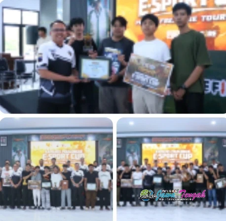 Kapolres Pekalongan menyerahkan piala kepada para pemenang dalam ajang Kapolres Pekalongan E-Sport Cup Tournament Free Fire dan PUBG yang digelar di Aula Setia Polres Pekalongan, Minggu (26/4/2026).